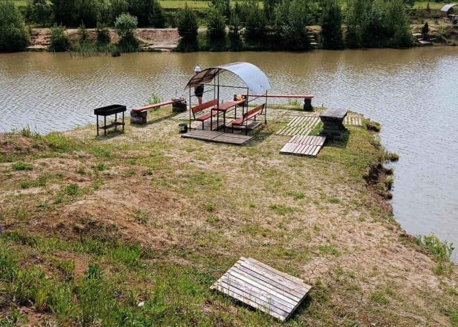 Стоянка, туалет, охрана — всё в цене путёвки. Можно взять удочку и подсачек в прокате, садок входит в путевку. Есть мостики, столики и мангал — устроишься как дома.